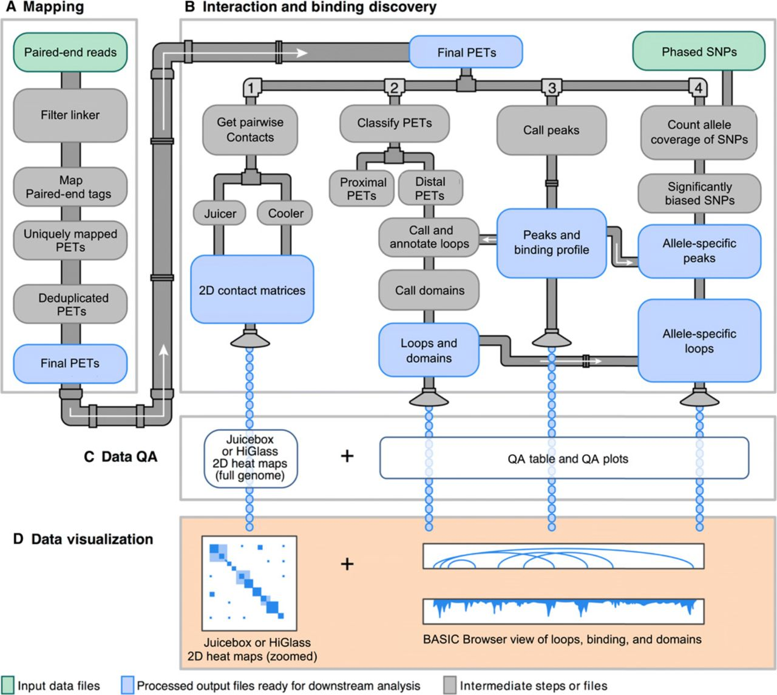 ChIA-PIPE, a fully automated pipeline for ChIA-PET data processing, quality assessment, visualization, and analysis. ChIA-PIPE performs linker filtering, read mapping, peak calling, and loop calling and automates quality control assessment for each dataset.