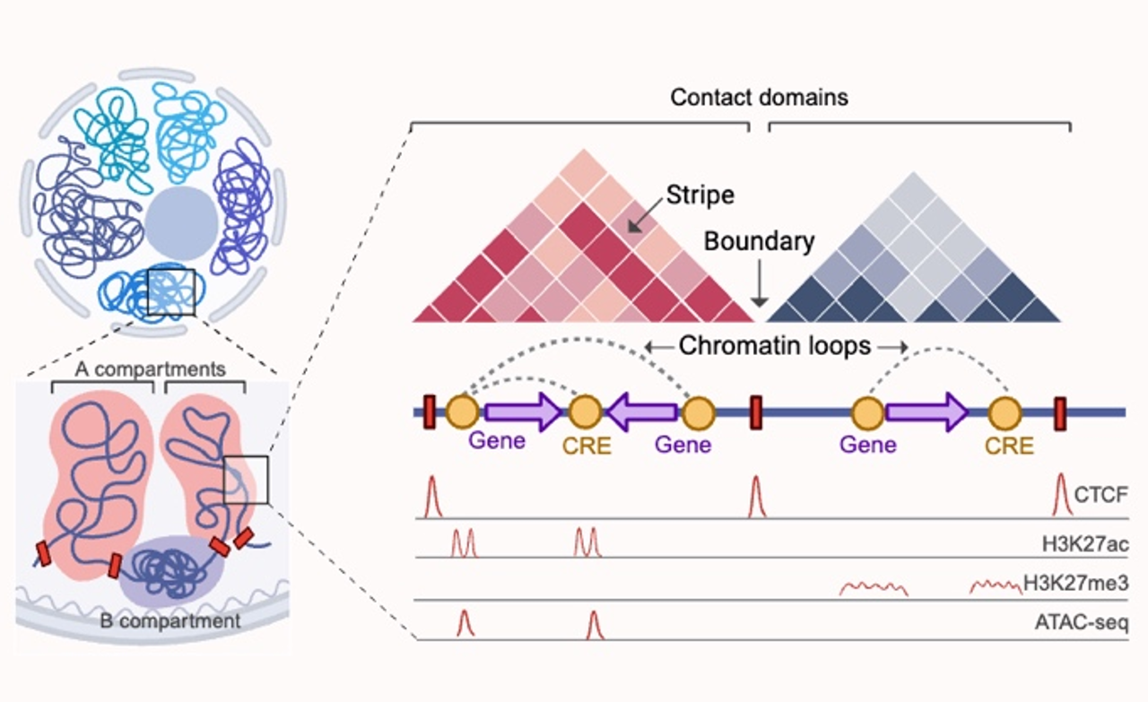 We also participated in the establishment of ChIA-PIPE, a data analysis process forin situ ChIA-PET . Subsequently, using small molecule library screening and in situ ChIA-PET , we discovered that bromodomain protein 9 (BRD9) plays an important role in maintaining cell stemness by regulating enhancer-promoter interactions . In addition, we have developed a new 3D genome visualization and analysis tool, EXPRESSO, which integrates the most comprehensive 3D genomics and epigenetics data available for download and viewing to date.