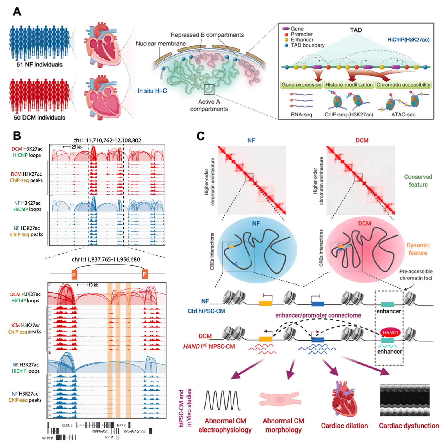 We published the first high-precision three-dimensional genomic map of human DCM and normal heart (H3K27ac HiChIP) and combined Hi-C, ChIP-seq, ATAC-seq, RNA-seq and other multi-omics data, which revealed the role of chromatin three-dimensional structural remodeling in the occurrence of DCM, and provided a new target for the future control of DCM and heart failure and the The study is of the following significance.The important findings of this study are as follows: i) A large number of aberrant enhancer-promoter interactions exist in DCM and are significantly associated with the upregulation of early cardiac developmental gene transcription; a class of non-transcribing promoters never reported in the past can act as enhancers to regulate the transcription of DCM-specific genes. ii) The enhancer/promoter regions of DCM-specific interactions have ATAC-seq regions, which can be used for the transcription of DCM genes. iii) The ATAC-seq region of DCM is a region of DCM that can be used for the regulation of DCM. (ii) The ATAC-seq signals of the DCM-specific enhancer/promoter regions were not significantly changed, which further suggested that DCM-specific gene transcription was not achieved by regulating chromatin openness, but by regulating remote chromatin interactions. iii) HAND1 was significantly enriched in the enhancer/promoter regions of the DCM-specific interactions, and overexpression of HAND1 induced enhancer-promoter interactions of cardiac developmental genes and the formation of DCM phenotype. iv) HAND1 was significantly enriched in the DCM-specific enhancer/promoter regions.